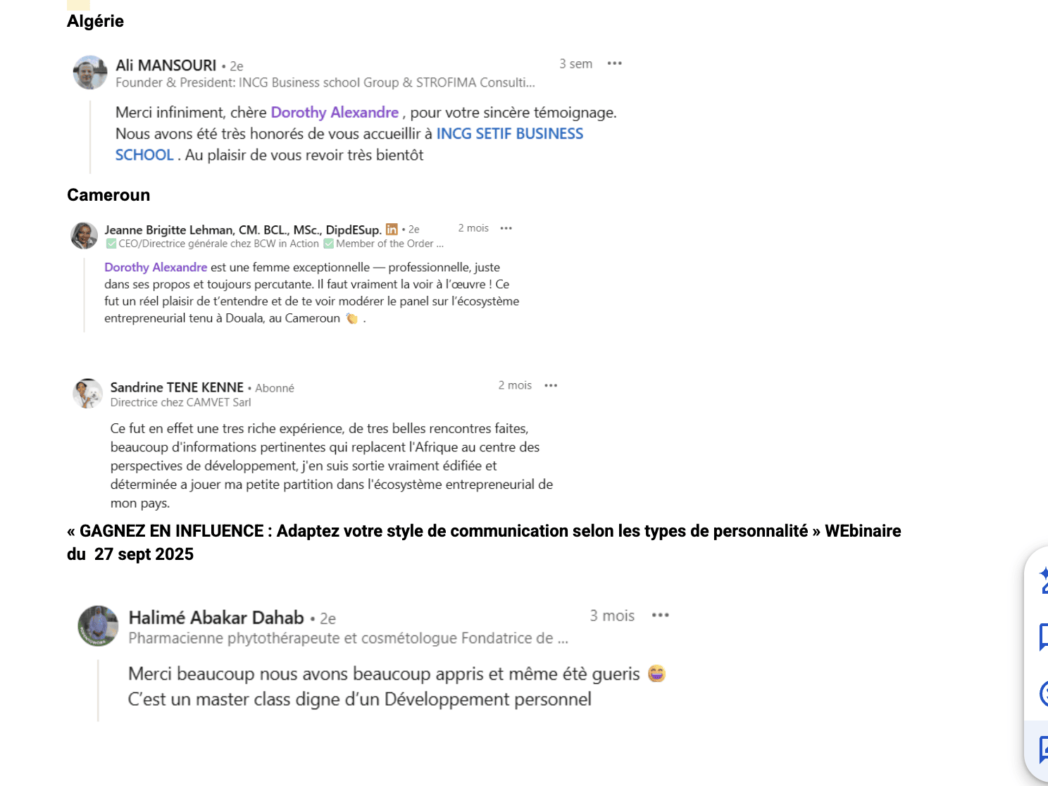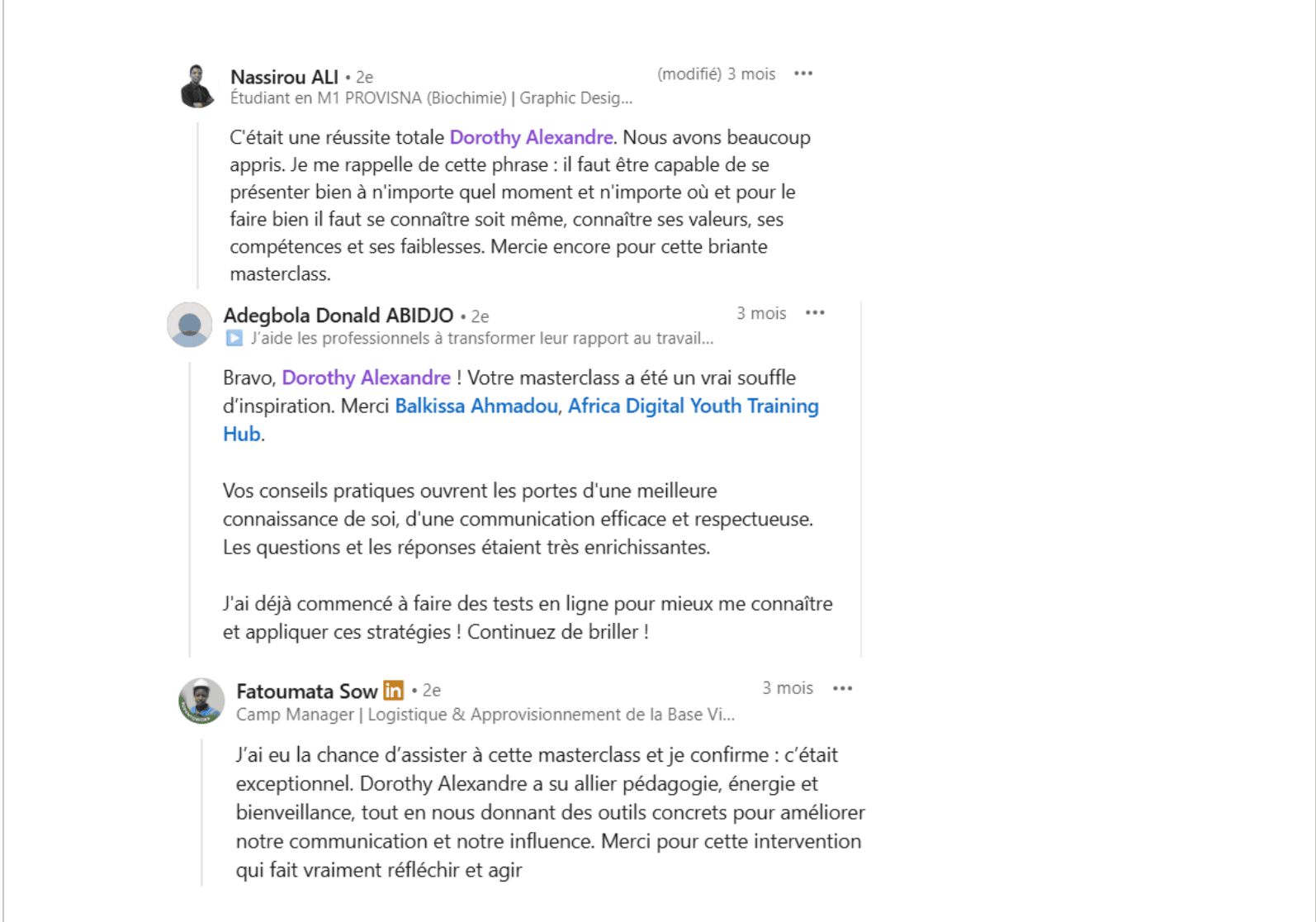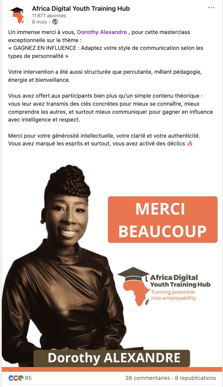 Depuis le lancement de l'Académie internationale en communication La Force de Nos Convictions, en mars 2025, Dorothy Alexandre a 𝐟𝐨𝐫𝐦é 𝐝𝐞𝐬 𝐜𝐞𝐧𝐭𝐚𝐢𝐧𝐞𝐬 𝐝𝐞 𝐩𝐞𝐫𝐬𝐨𝐧𝐧𝐞𝐬 - 𝐣𝐞𝐮𝐧𝐞𝐬 𝐞𝐭 𝐦𝐨𝐢𝐧𝐬 𝐣𝐞𝐮𝐧𝐞𝐬 - originaires de 𝐩𝐥𝐮𝐬 𝐝'𝐮𝐧𝐞 𝐪𝐮𝐢𝐧𝐳𝐚𝐢𝐧𝐞 𝐝𝐞 𝐩𝐚𝐲𝐬, notamment : 🇨🇦 Canada, 🇧🇯 Bénin, 🇿🇦 Afrique du Sud, 🇸🇳 Sénégal, 🇨🇮 Côte d'Ivoire, 🇲🇶 Martinique, 🇨🇬 République du Congo, 🇩🇿 Algérie, 🇬🇦 Gabon, 🇧🇫 Burkina Faso, 🇨🇩 République démocratique du Congo, 🇦🇴 Angola, 🇰🇪 Kenya, 🇳🇪 Niger et 🇫🇷 France.