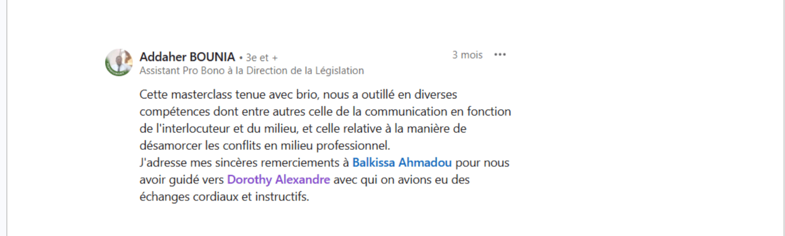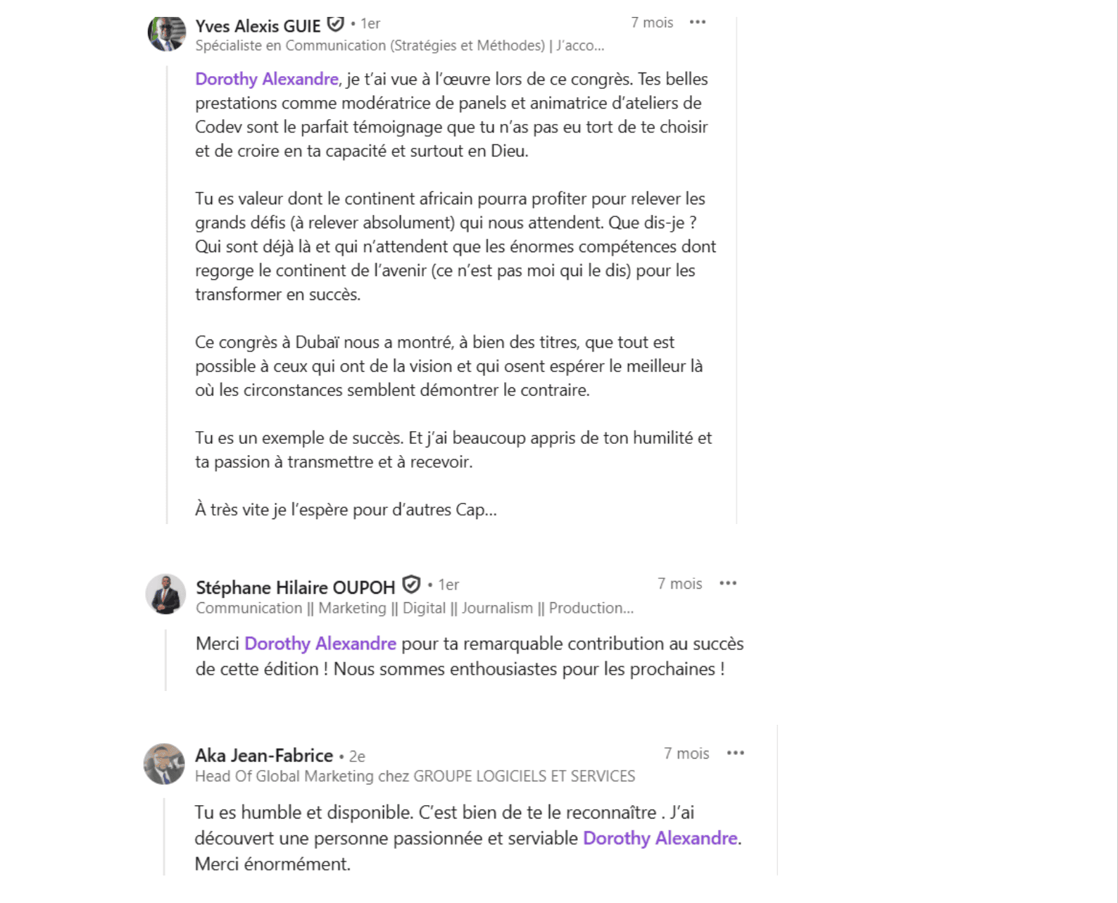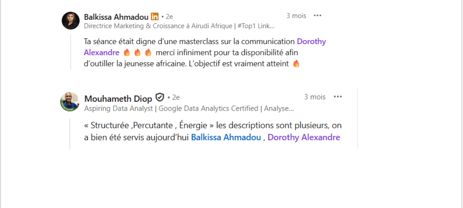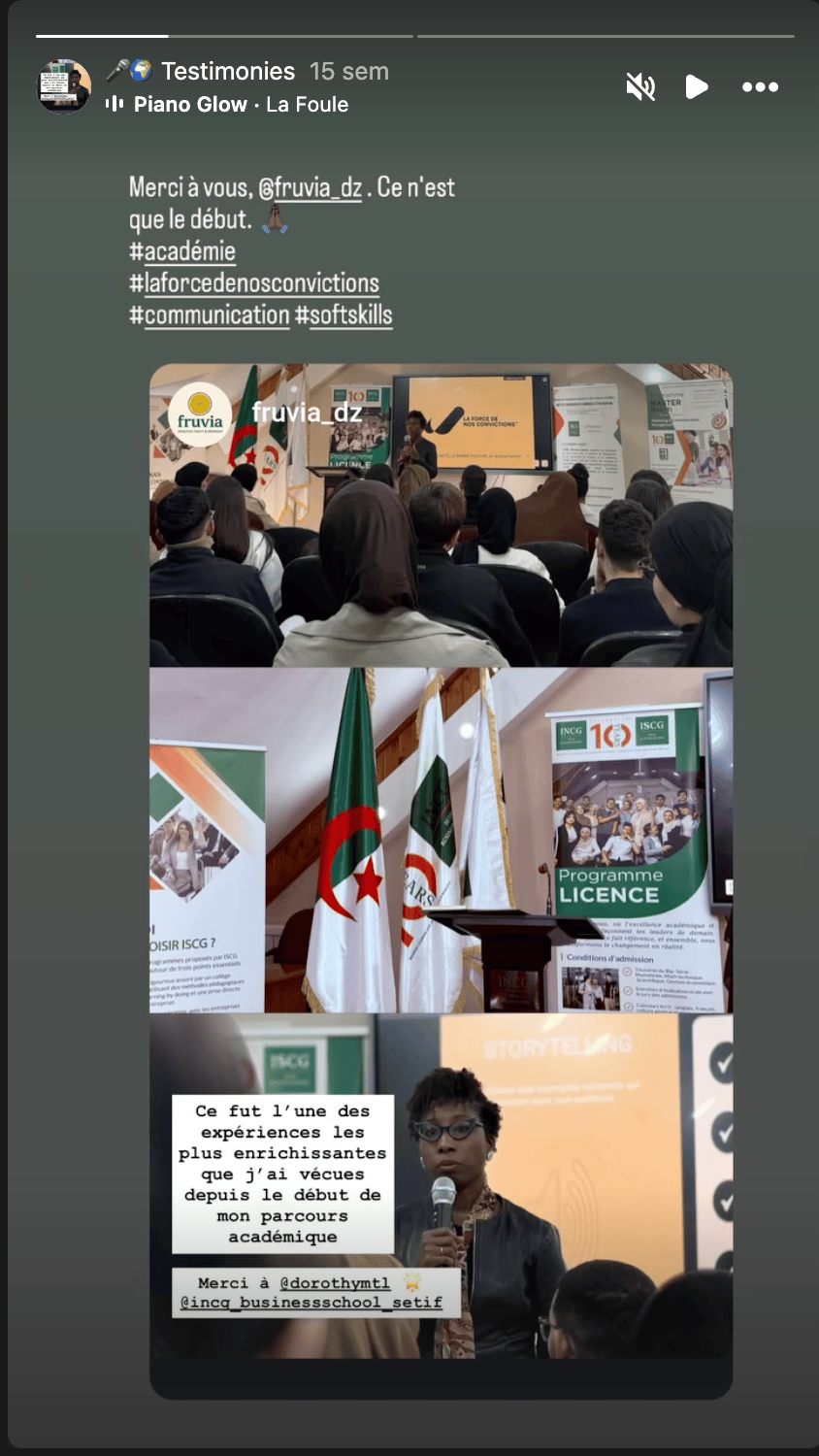 Depuis le lancement de l'Académie internationale en communication La Force de Nos Convictions, en mars 2025, Dorothy Alexandre a 𝐟𝐨𝐫𝐦é 𝐝𝐞𝐬 𝐜𝐞𝐧𝐭𝐚𝐢𝐧𝐞𝐬 𝐝𝐞 𝐩𝐞𝐫𝐬𝐨𝐧𝐧𝐞𝐬 - 𝐣𝐞𝐮𝐧𝐞𝐬 𝐞𝐭 𝐦𝐨𝐢𝐧𝐬 𝐣𝐞𝐮𝐧𝐞𝐬 - originaires de 𝐩𝐥𝐮𝐬 𝐝'𝐮𝐧𝐞 𝐪𝐮𝐢𝐧𝐳𝐚𝐢𝐧𝐞 𝐝𝐞 𝐩𝐚𝐲𝐬, notamment : 🇨🇦 Canada, 🇧🇯 Bénin, 🇿🇦 Afrique du Sud, 🇸🇳 Sénégal, 🇨🇮 Côte d'Ivoire, 🇲🇶 Martinique, 🇨🇬 République du Congo, 🇩🇿 Algérie, 🇬🇦 Gabon, 🇧🇫 Burkina Faso, 🇨🇩 République démocratique du Congo, 🇦🇴 Angola, 🇰🇪 Kenya, 🇳🇪 Niger et 🇫🇷 France.