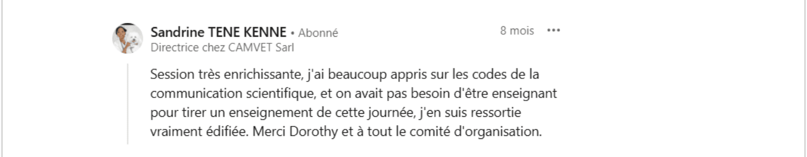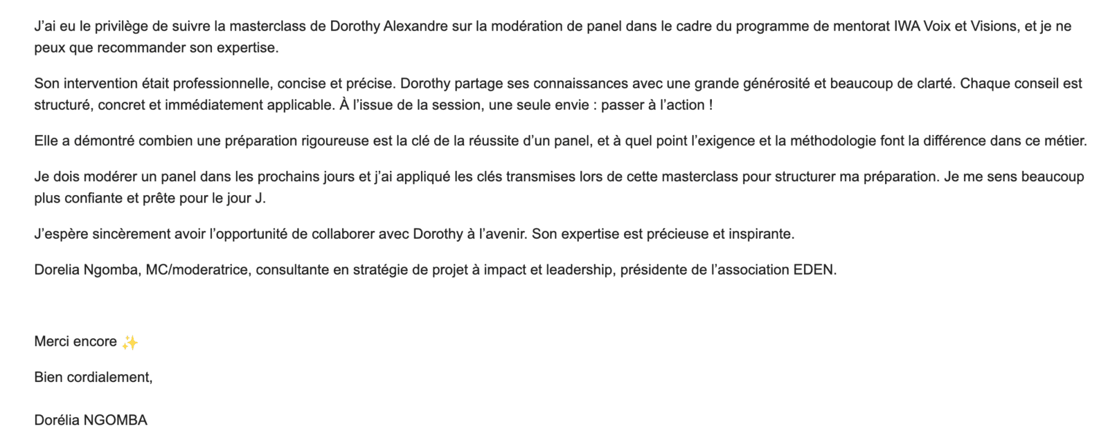 Son approche empathique et ses perspectives stratégiques font d'elle une mentore idéale pour celle et ceux qui cherchent à surmonter les obstacles à la communication et à atteindre leurs objectifs personnels et professionnels. Que vous souhaitiez améliorer votre prise de parole en public, peaufiner votre message ou optimiser votre communication interculturelle, Dorothy se consacre à vous aider à libérer votre plein potentiel