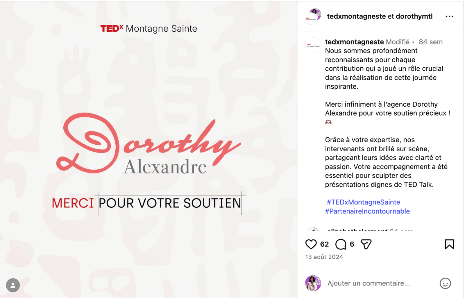 COLLABORATIONS & PARTENARIATS Depuis 2016, Dorothy Alexandre a partagé son expertise et sa passion avec +70 organisations à l'échelle du Canada et à travers l'Afrique, incluant :